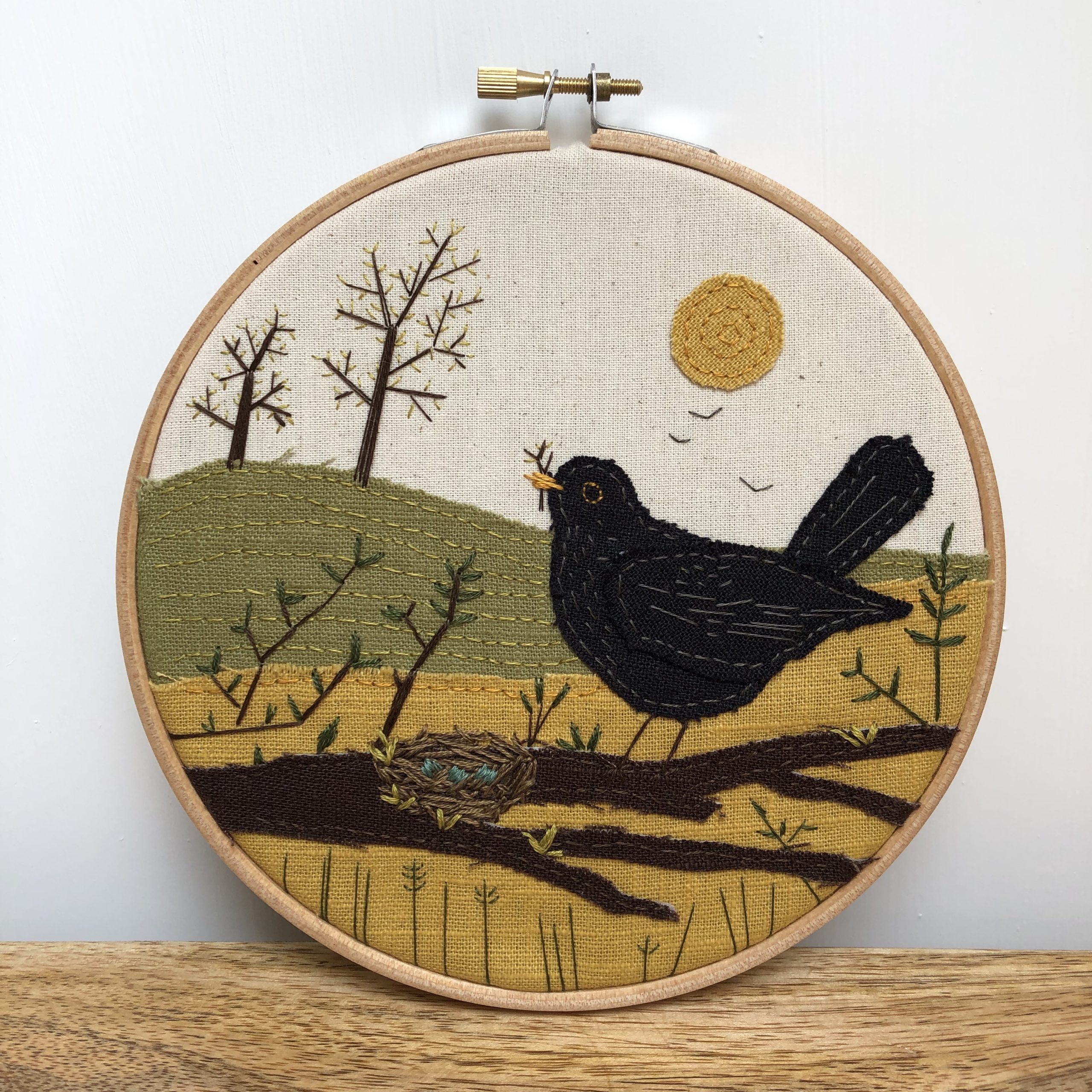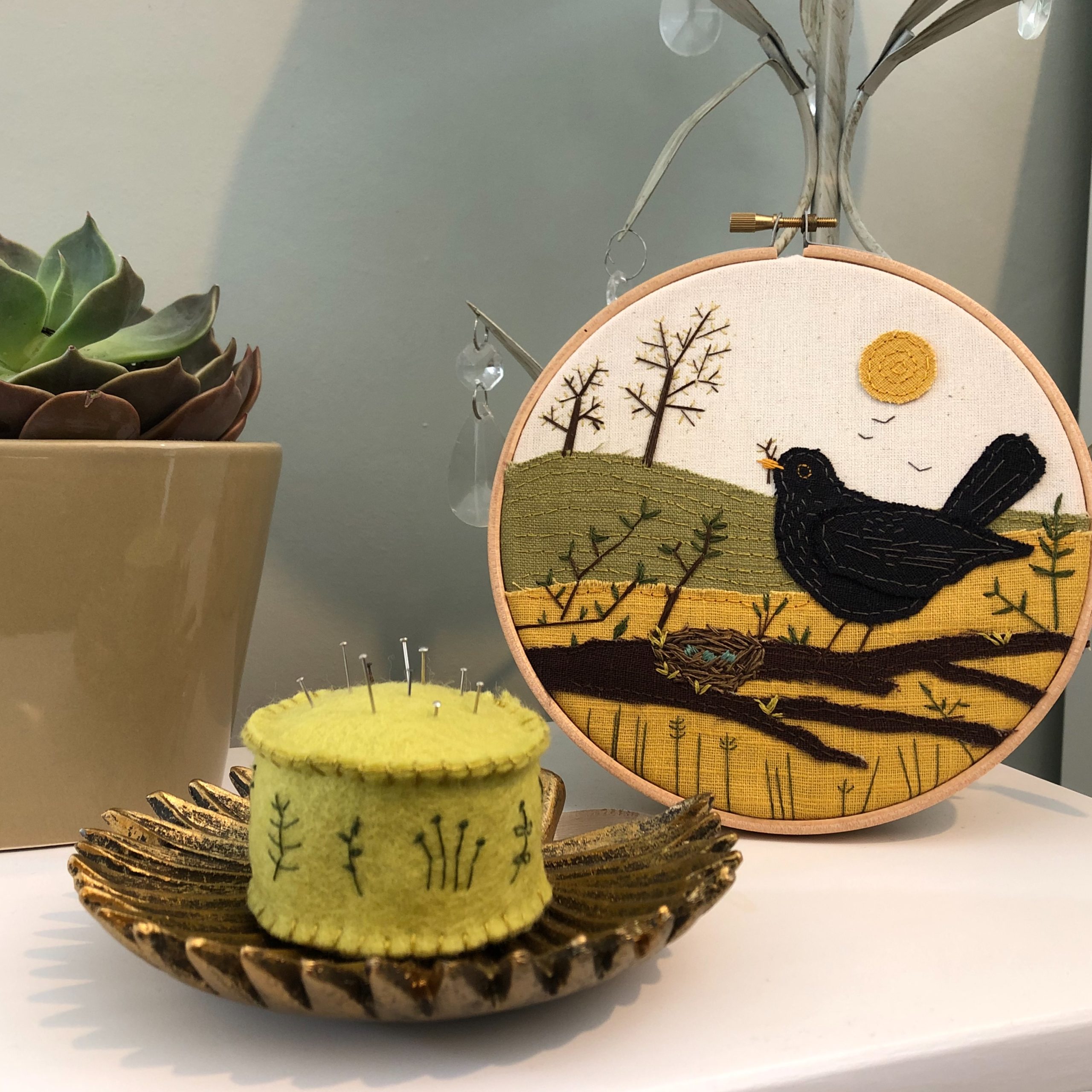 There were two projects to complete, both with clear step-by-step instructions and photographs of each stage. The larger project used the embroidery hoop, fabric and thread to create an appliqué picture inspired by the artwork Blackbird’s Nest by Gordy Wright. The project was created by building up layers of fabric and adding texture and detail using the thread. It was really satisfying to see the image progress as I added each layer. Some of the stitching was quite fiddly, particularly the positioning and sizing of the blackbird’s eye and also the grass at the bottom of the frame as you had to remove the frame and replace it for each stitch so it looked as though the grass was growing from below the frame. The final result does look good so I think making the effort to get it right was worth it.