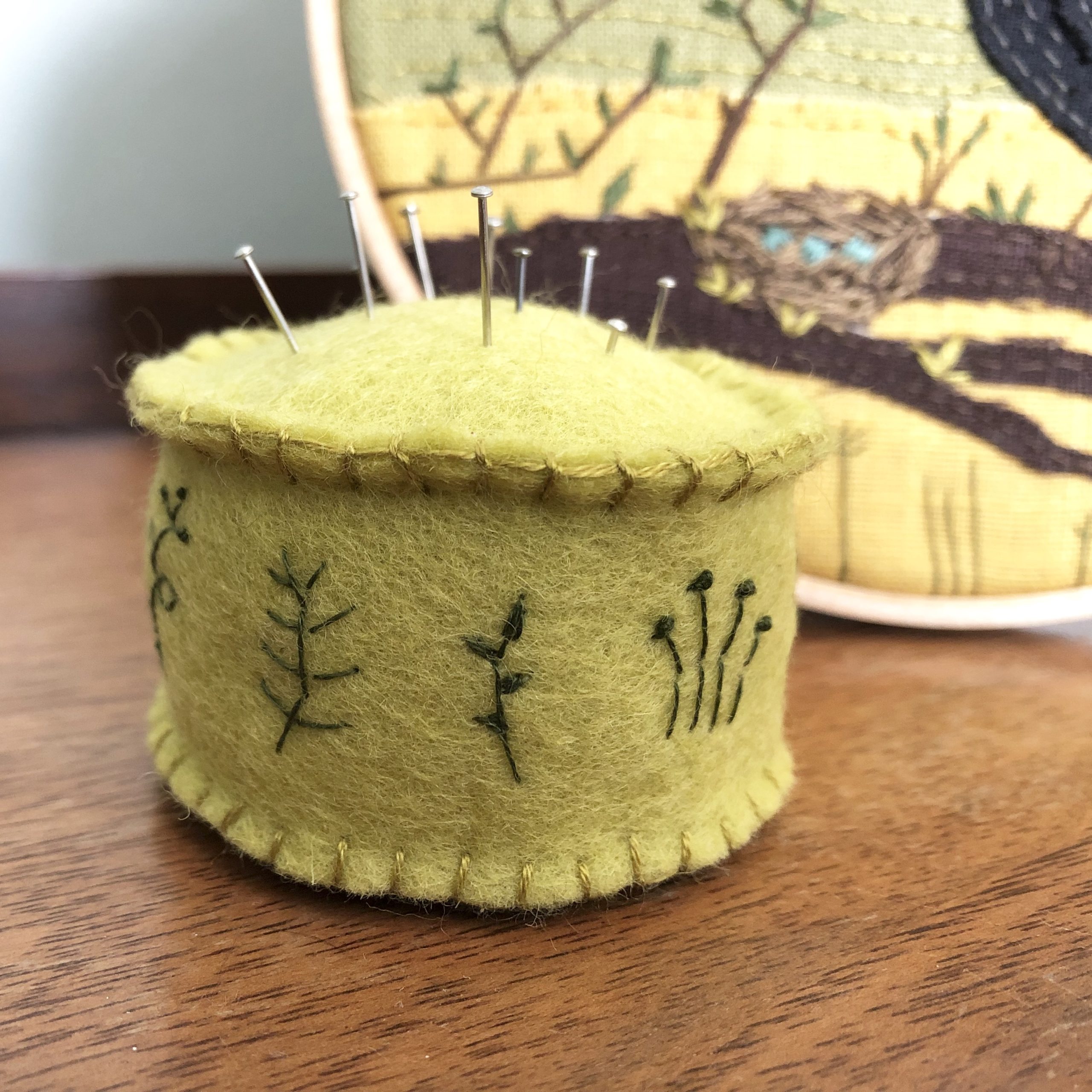 The smaller project was a felt pin cushion with small embroidered plants around the edge. This didn’t take me long to finish at all and the result is not only cute but useful too! It was made from three pieces of felt. I embroidered the side piece first. Some ideas for decoration were included on the pattern. The three pieces were then attached together to create the shape and filled with rice and the fleece stuffing. It said in the instructions that you can buy proper beans for filling pin cushions to create the weight at the bottom, but rice or lentils would also be fine. As I already had some rice in the cupboard I decided to go with that!