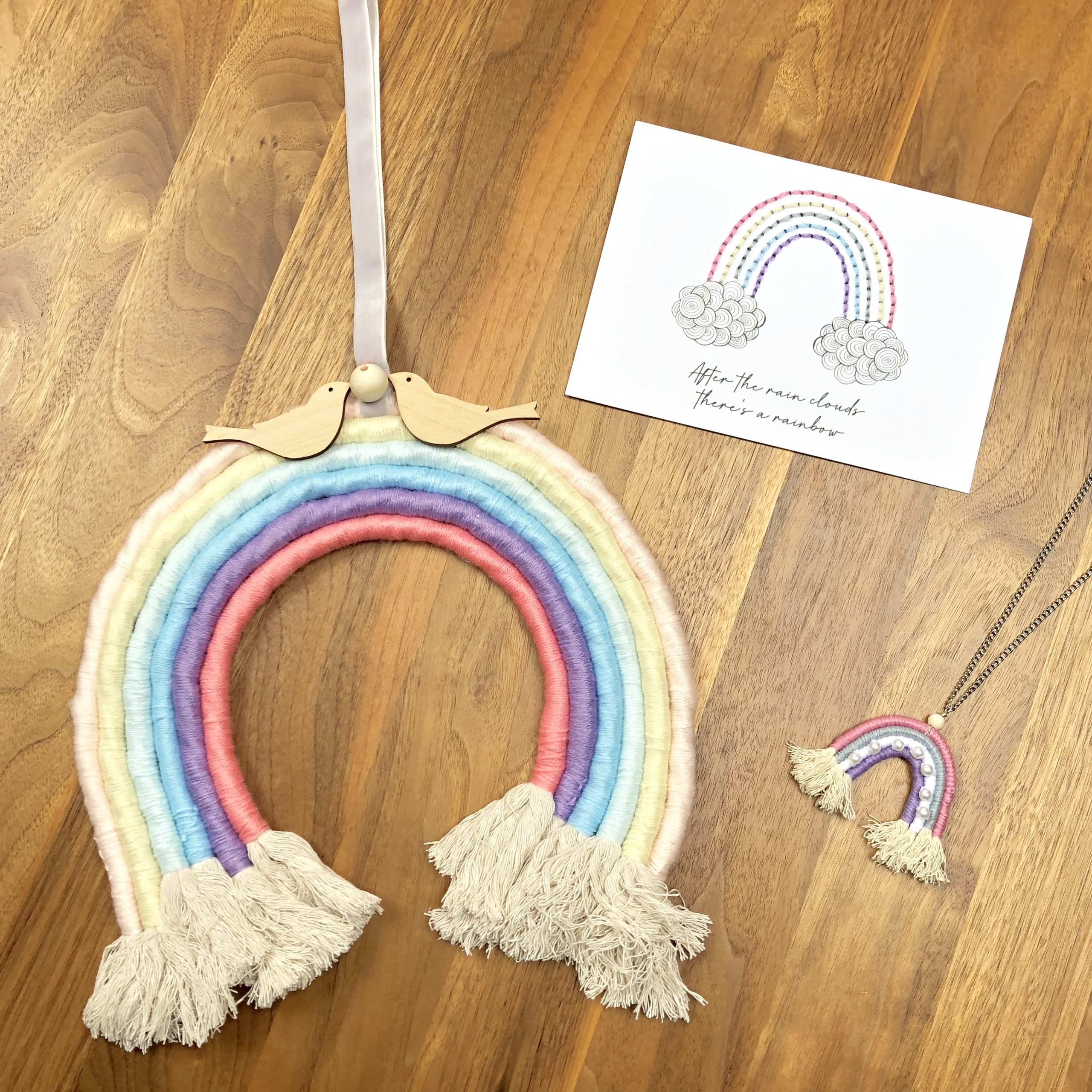 There were three projects to make; a large woven rainbow wall hanging, a woven rainbow necklace and an embroidered postcard.