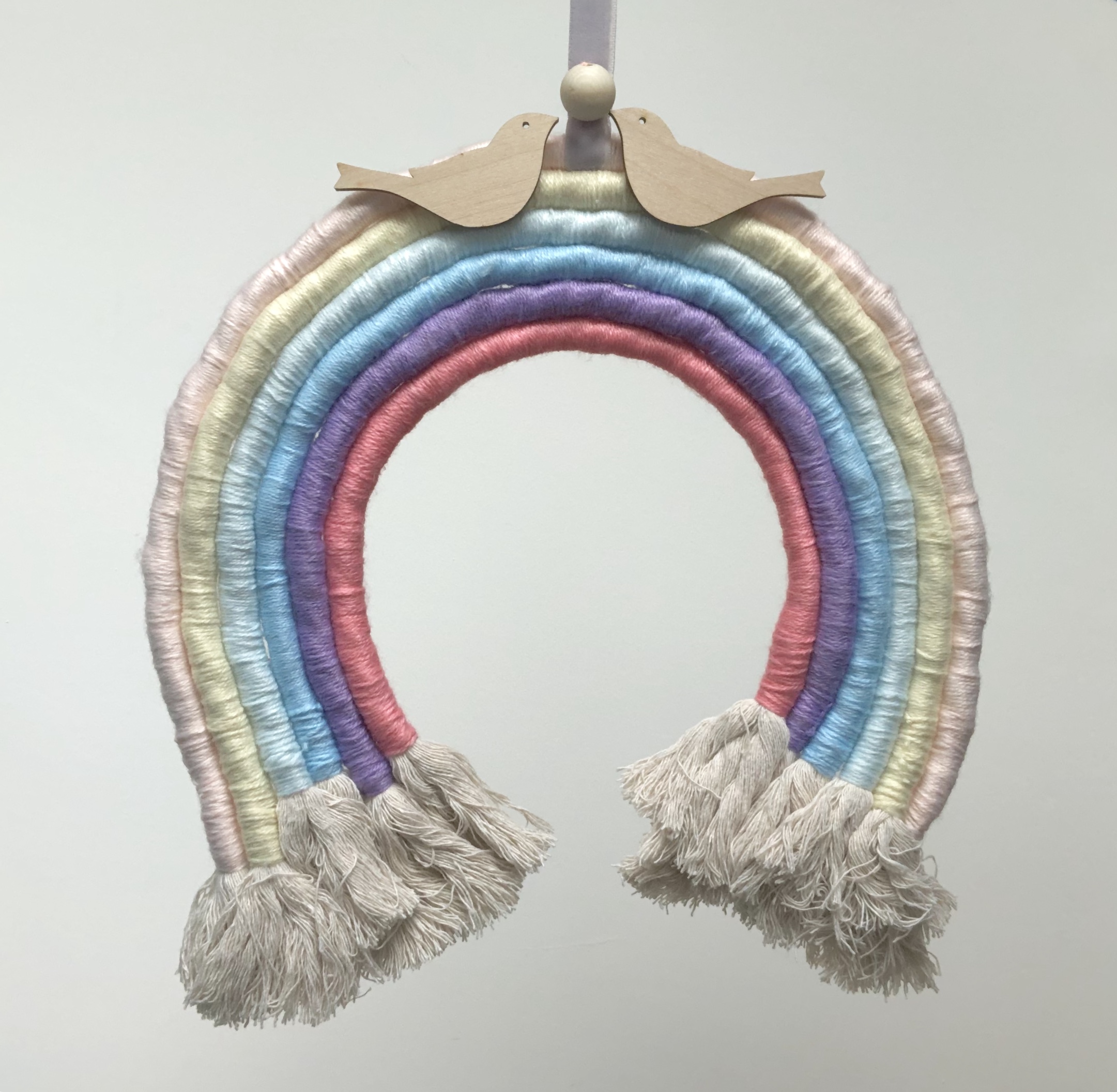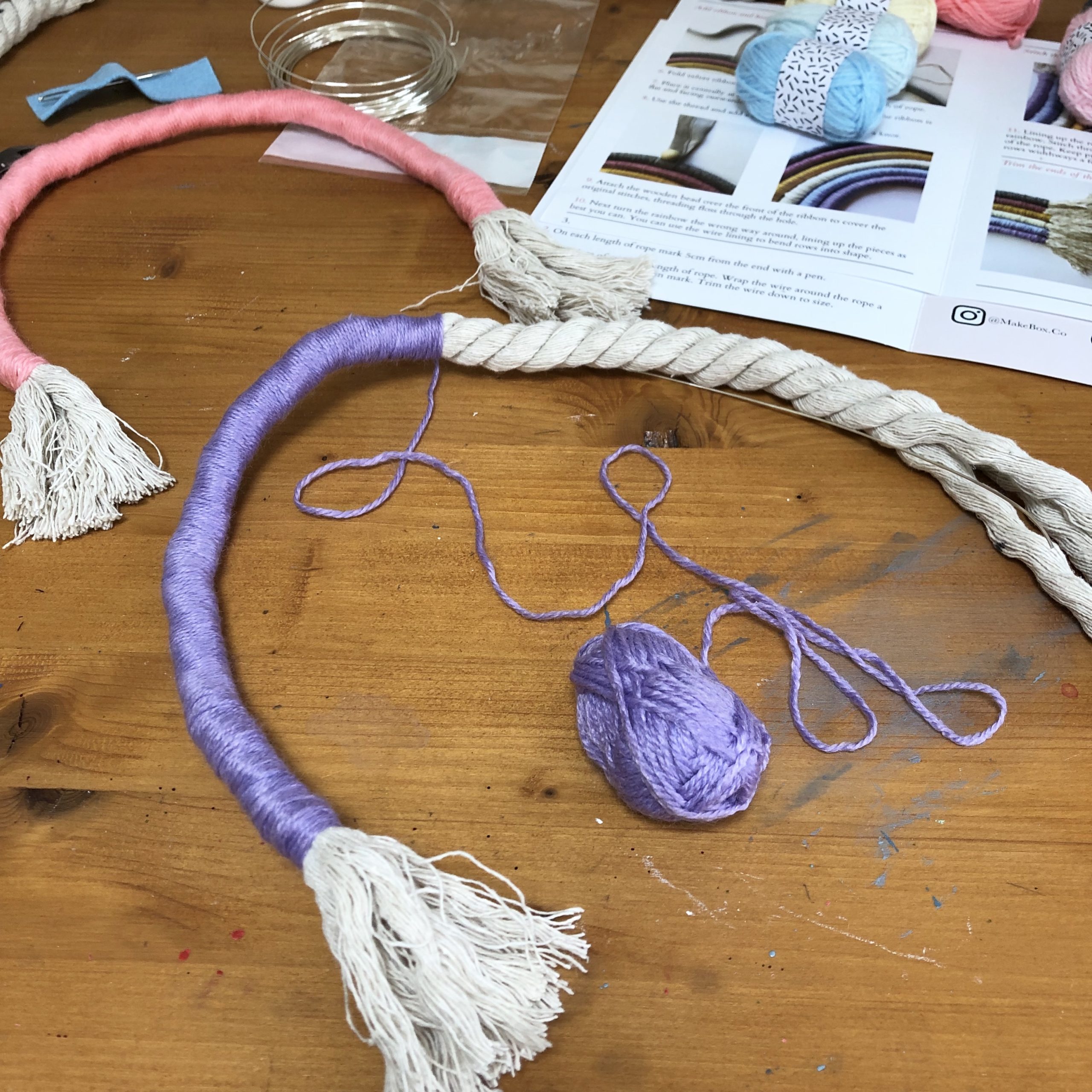 The wall hanging and necklace were made in the same way by wrapping the yarn around varying lengths of rope and wire. The wire gave it stability and allowed you to form it into the correct shape. The balls of yarn were a random selection of colours, which didn’t give you the option of following a regular rainbow pattern, but did mean that your wall hanging would be unique. The rope I had was not the same as the type in the instruction photographs and it meant that it came unravelled really quickly as I was trying to wrap the yarn around it, which made it a bit tricky to keep it under control at times. I think it may also have affected the length of some of my pieces as they didn’t seem to match up as well after I’d wrapped them! Once each length of rope was wrapped you had to add a ribbon (or wire in the case of the necklace) and wooden bead to the top colour before stitching them all together on the back. This ensured that all the pieces were kept in place. The wall hanging then had the wooden songbirds added using super glue. The necklace had the pearls stitched on to look like raindrops and the chain added.