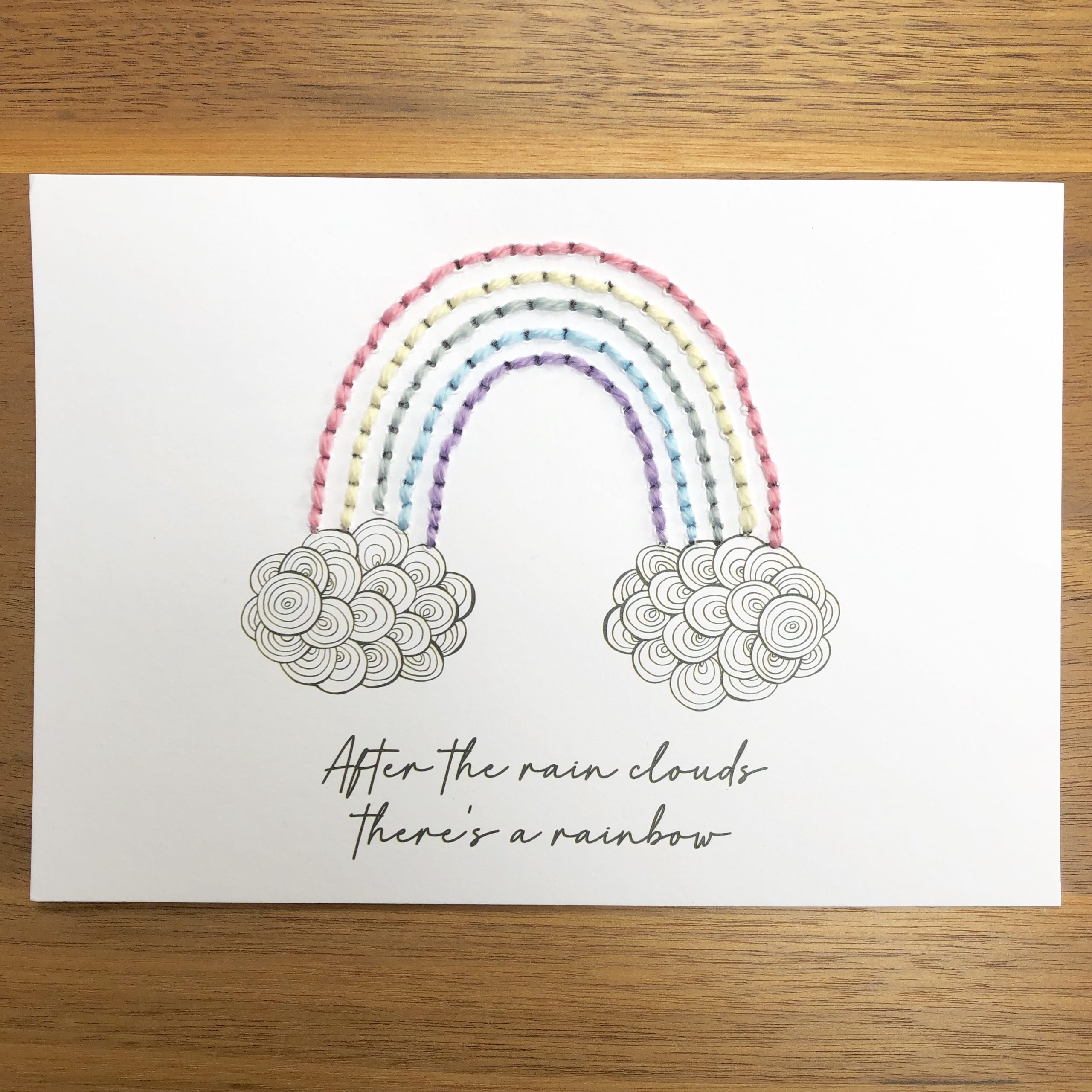 Lastly I completed the embroidered postcard. Using the leftover yarn from the other two projects I backstitched each layer of the rainbow to create a lovely piece of art which I’m going to hang on my inspiration wall in my studio. I especially love the quote on it – “After the rain clouds there’s a rainbow.”