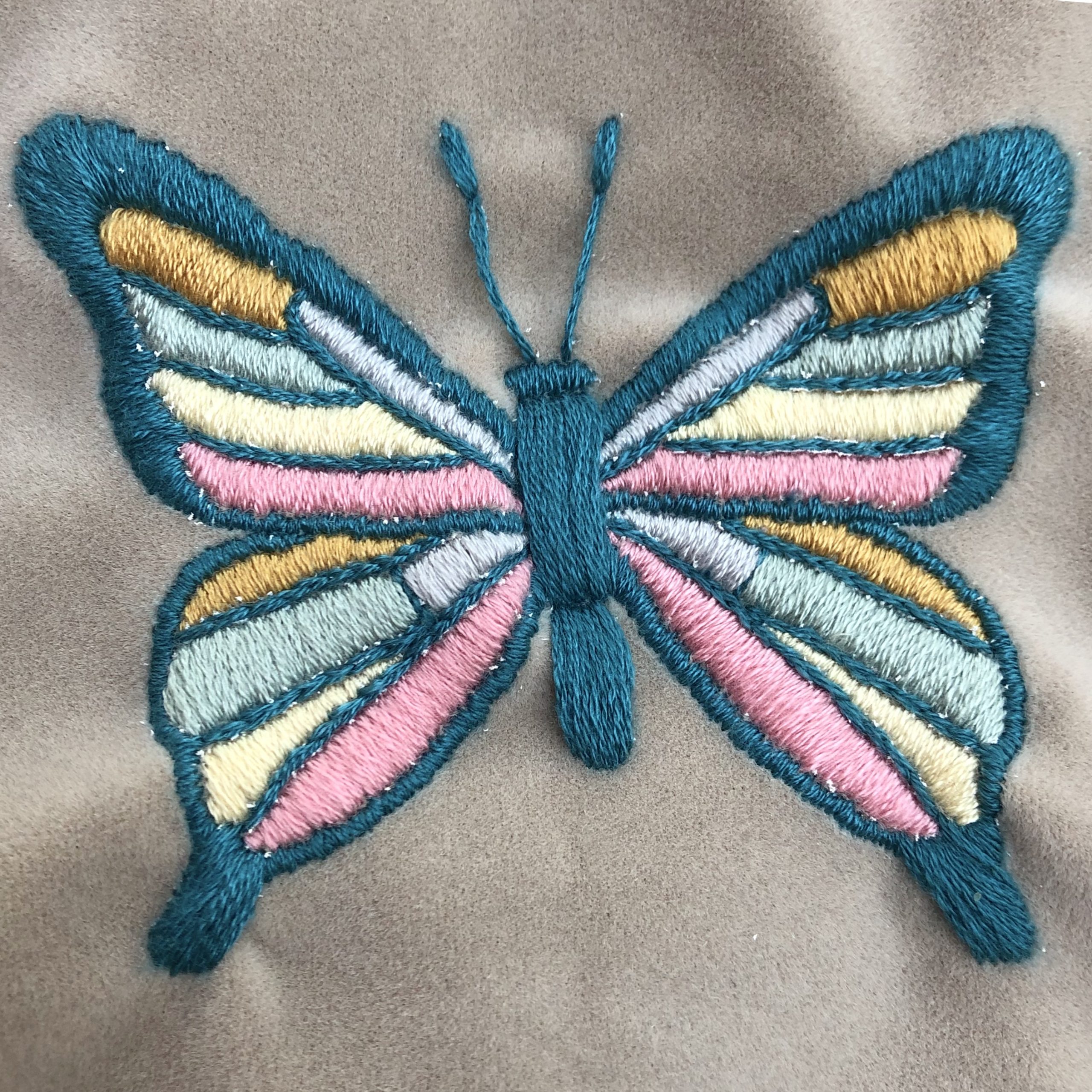 I started off embroidering the butterfly using the hoop to keep my work taut. At first I followed the same pattern as the picture using the teal thread for the edges but I decided to include the veins on my butterfly using a split stitch and then filling in each section using a satin stitch and the other coloured threads. That’s one of the things I love about craft; it’s great to have instructions to follow but there’s always an opportunity to add your own twist on something and make it your own. Sewing the butterfly was probably the longest part of the kit and I did it over several days. It’s quite a large design.