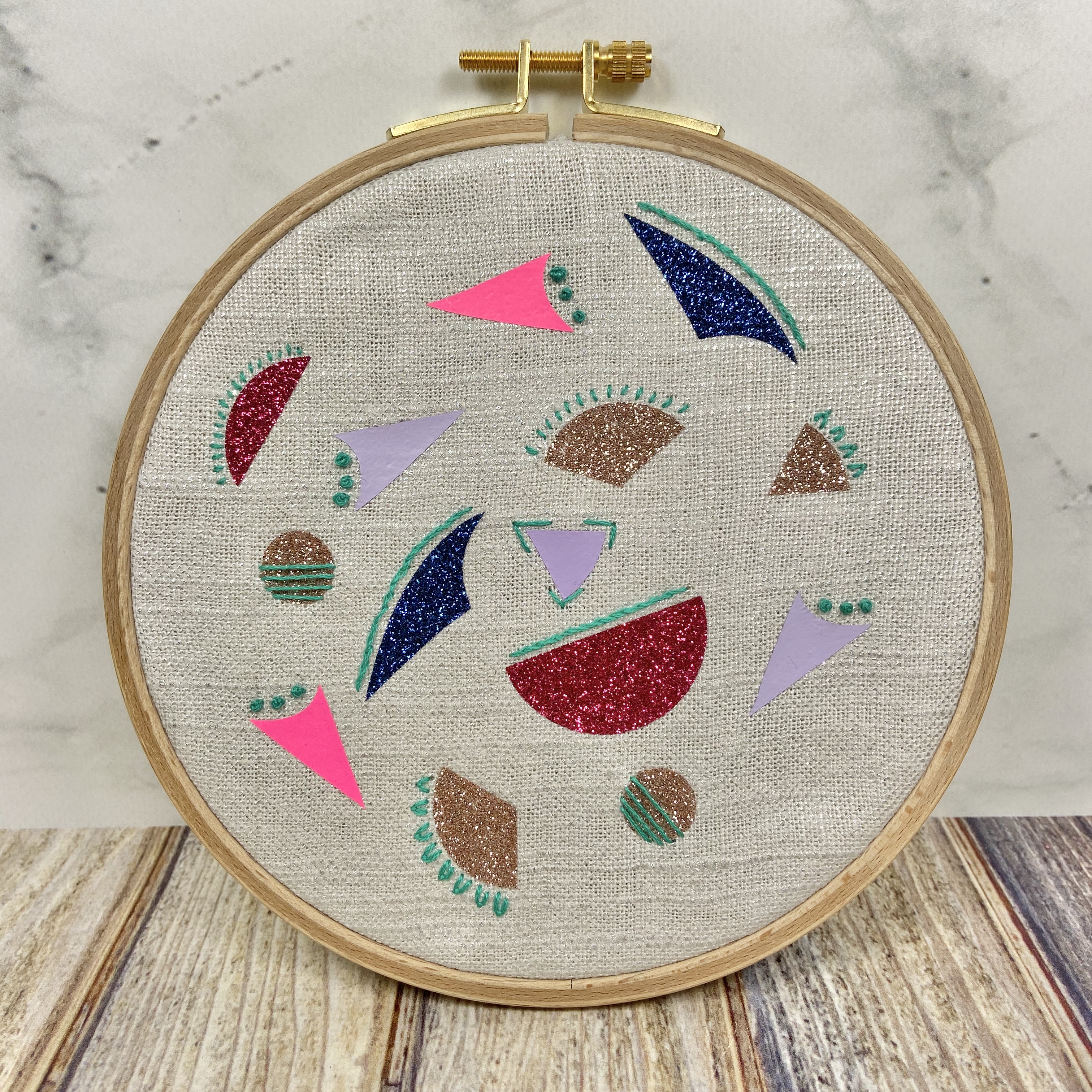 Anyway, I went along to the office in Holborn to take part in a Mindful Embroidery workshop. As we walked in the table looked so colourful. It was laid out with plenty of embroidery thread, piles of vinyl, different types of fabric and lots of example of what we would be making. The idea was to use the iron-on vinyl to create an abstract pattern which we could then embroider over the top of. Christine talked through some of her examples and showed us how some of them had stayed quite random but others had developed into a design where her eye had caught different shapes amongst the randomness.