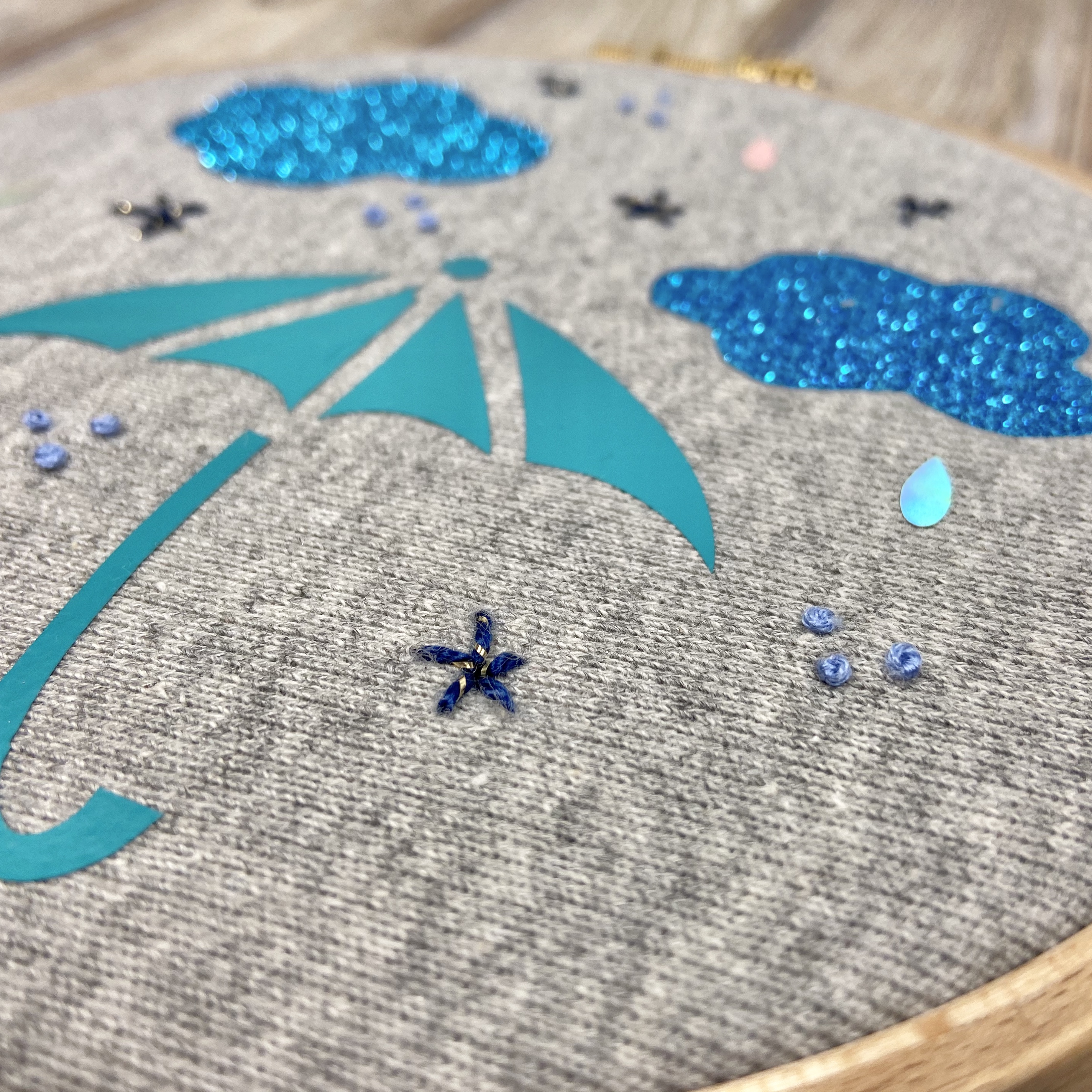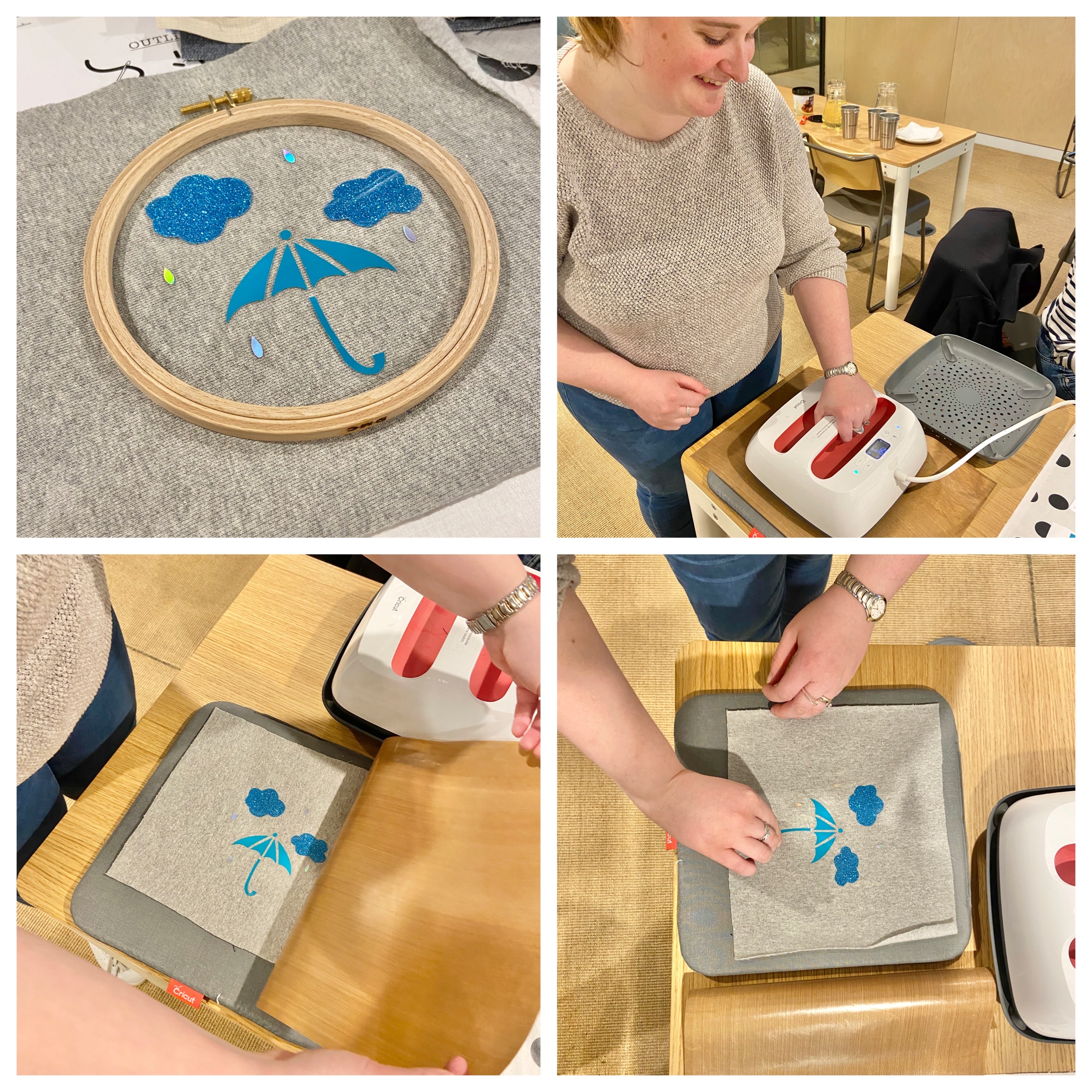 I made one that was random, although the pieces I chose were in complementary colours, but my other piece was a bit more literal. I couldn’t help myself! My mind just likes to create order even when I’m telling it to be chaotic! I found a piece of vinyl that looked like the top of an umbrella to me so I gave it a handle and created a little rainy scene, cutting clouds out of some glittery blue vinyl and adding some raindrops. Once we had decided on our patterns Christine showed us how to use the iron to attach the vinyl on to our chosen fabric.