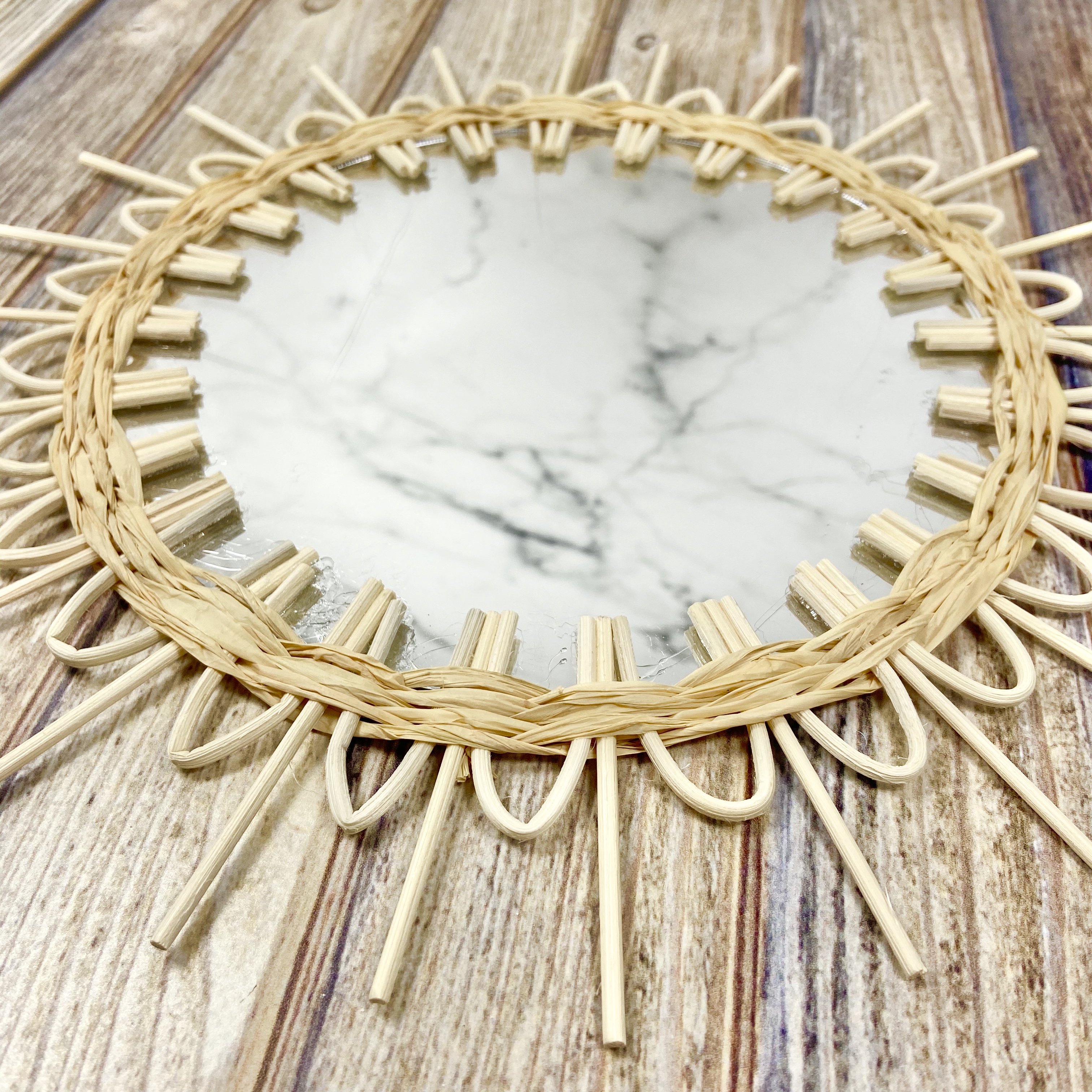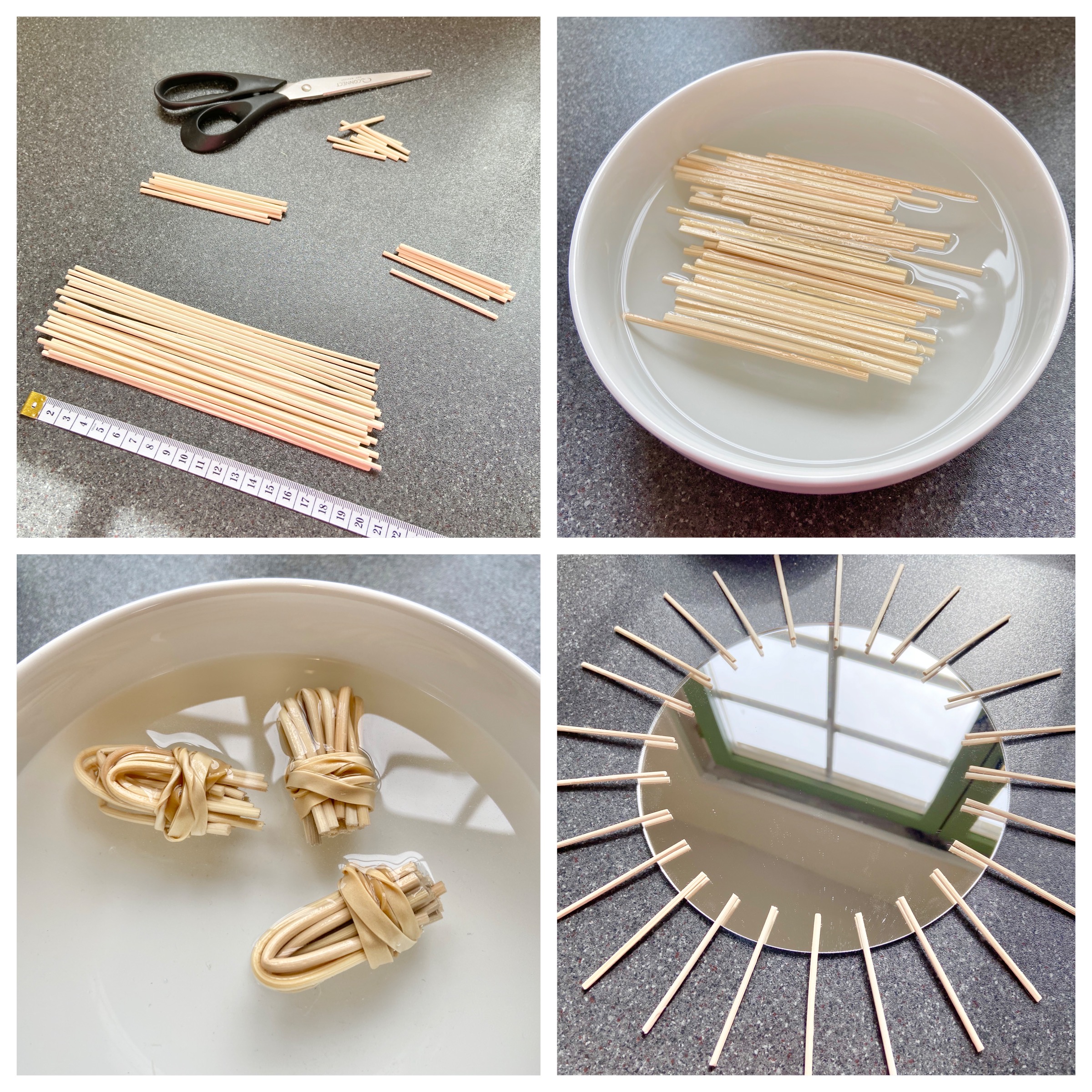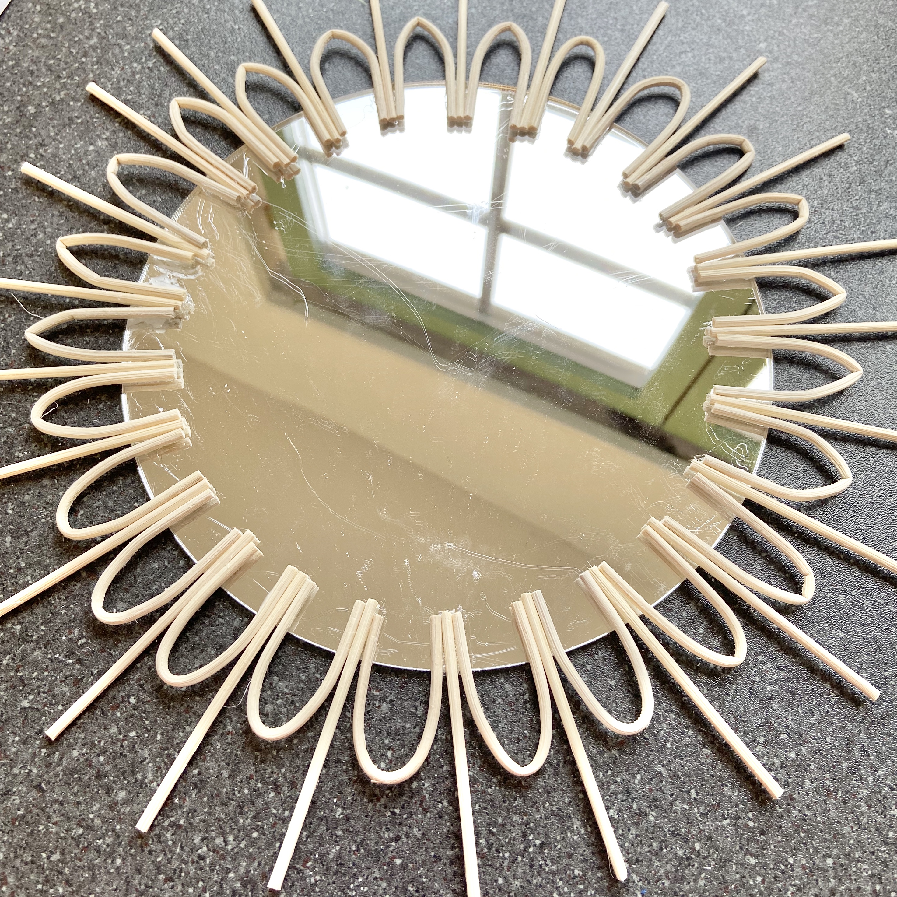 I decided to go for design two as I wanted to try out the extra technique of soaking and bending the rattan sticks. This is obviously more time consuming as you have to soak the sticks in order to bend them, then soak them in their final shape and then dry them before they can be used. This does however give the glue time to dry on the first lot of sticks you attach to the mirror.