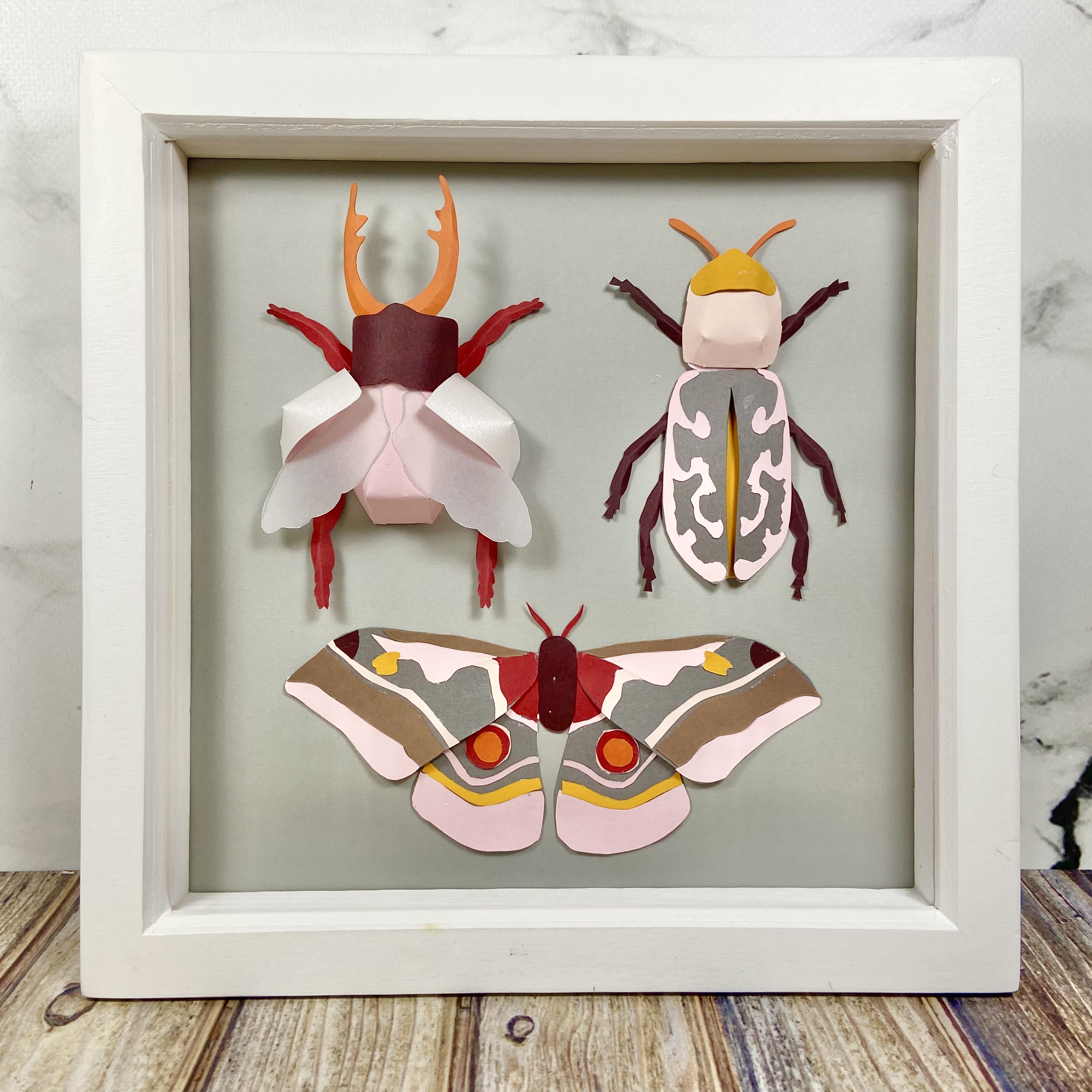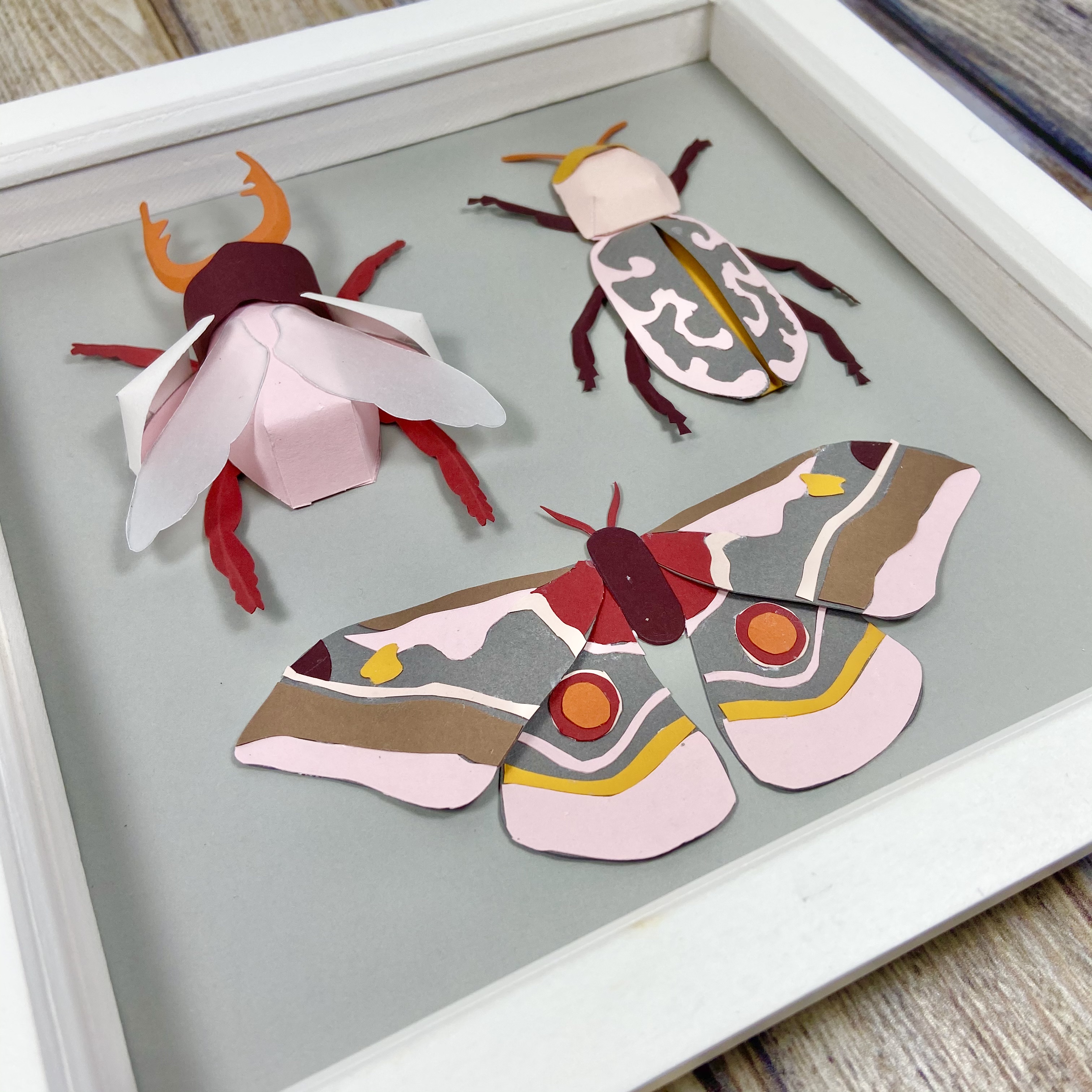 The first project was to create a bug display made up of a moth, a patterned beetle and a winged beetle. Although the moth was flat, it was still a complicated piece with a lot of tiny pieces to glue on. Both the beetles had 3D elements that really brought them to life.