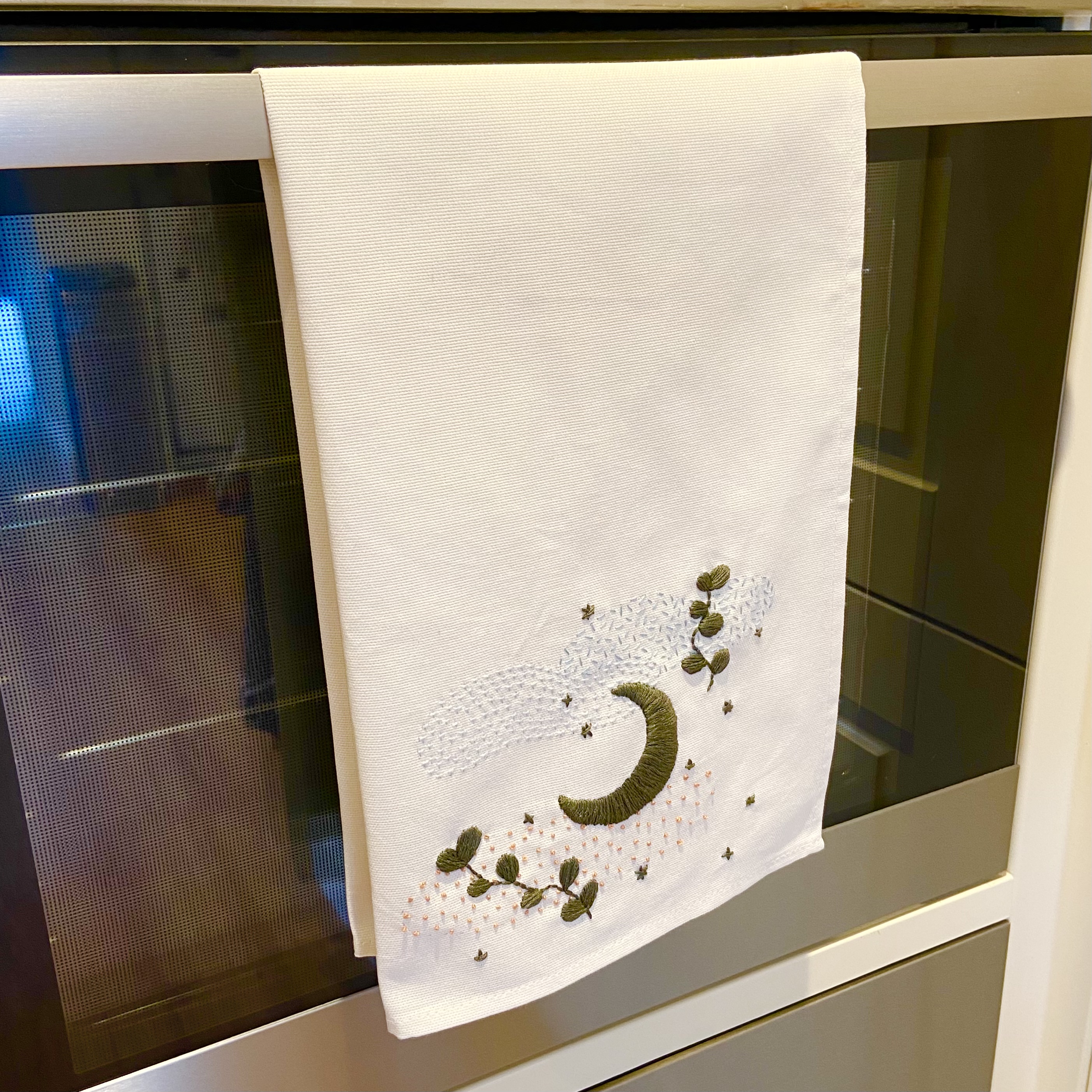 Back to embroidery for me this week with the moon tea towel from Craftiosity. I really like the idea behind the design of this embroidery of the waxing moon representing a period of building energy and achieving goals. Nice to have a reminder of this in the kitchen whilst I’m doing the washing up!