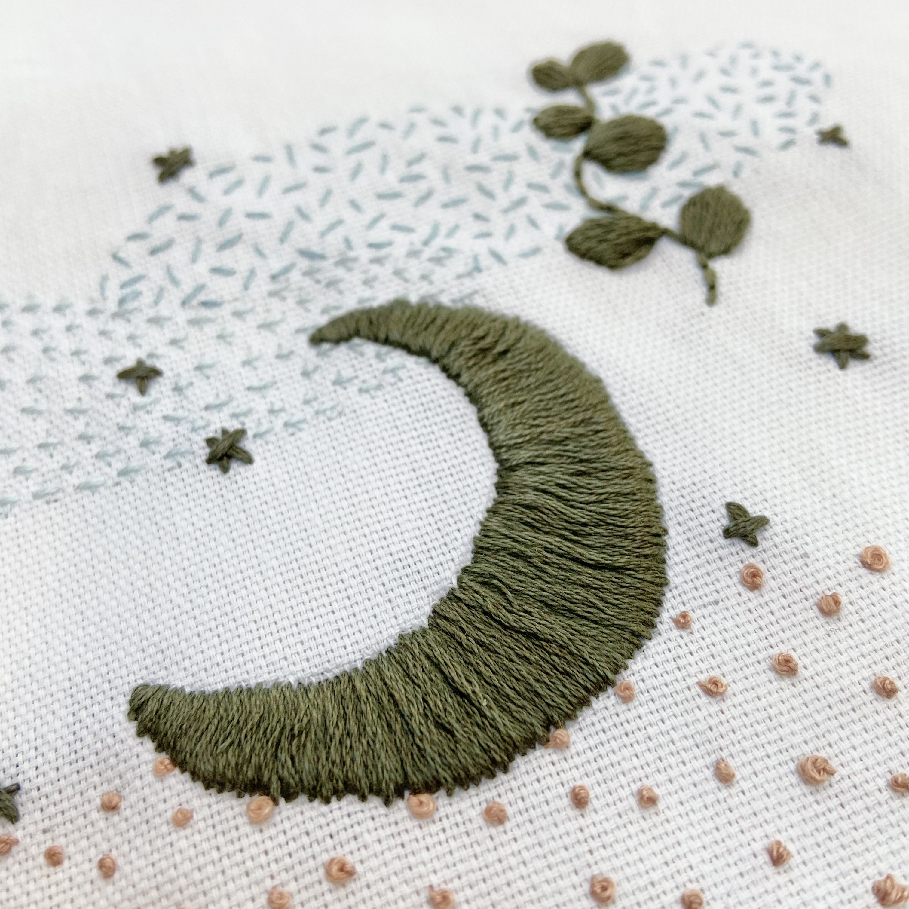 The moon was stitched in satin stitch using all six strands of the thread and the leaves were meant to be the same, but I felt as though I didn’t have enough left to complete them so I changed to only using three strands for the leaves. As the area of the leaves was a lot smaller than the moon it didn’t really make a difference to the overall look.