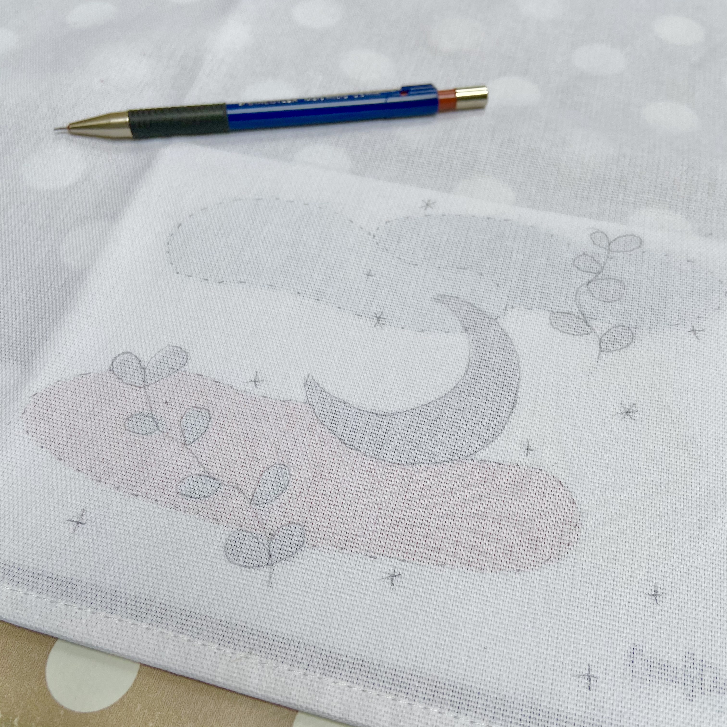 The template was used to trace the design lightly onto the tea towel using a pencil and a dotted line rather than a solid line for the clouds as they wouldn’t be filled in completely. The instructions said to only trace the clouds first and then put the outline of the moon and foliage in later, but I doubted my ability to line up the pattern again so I just traced it all at once!
