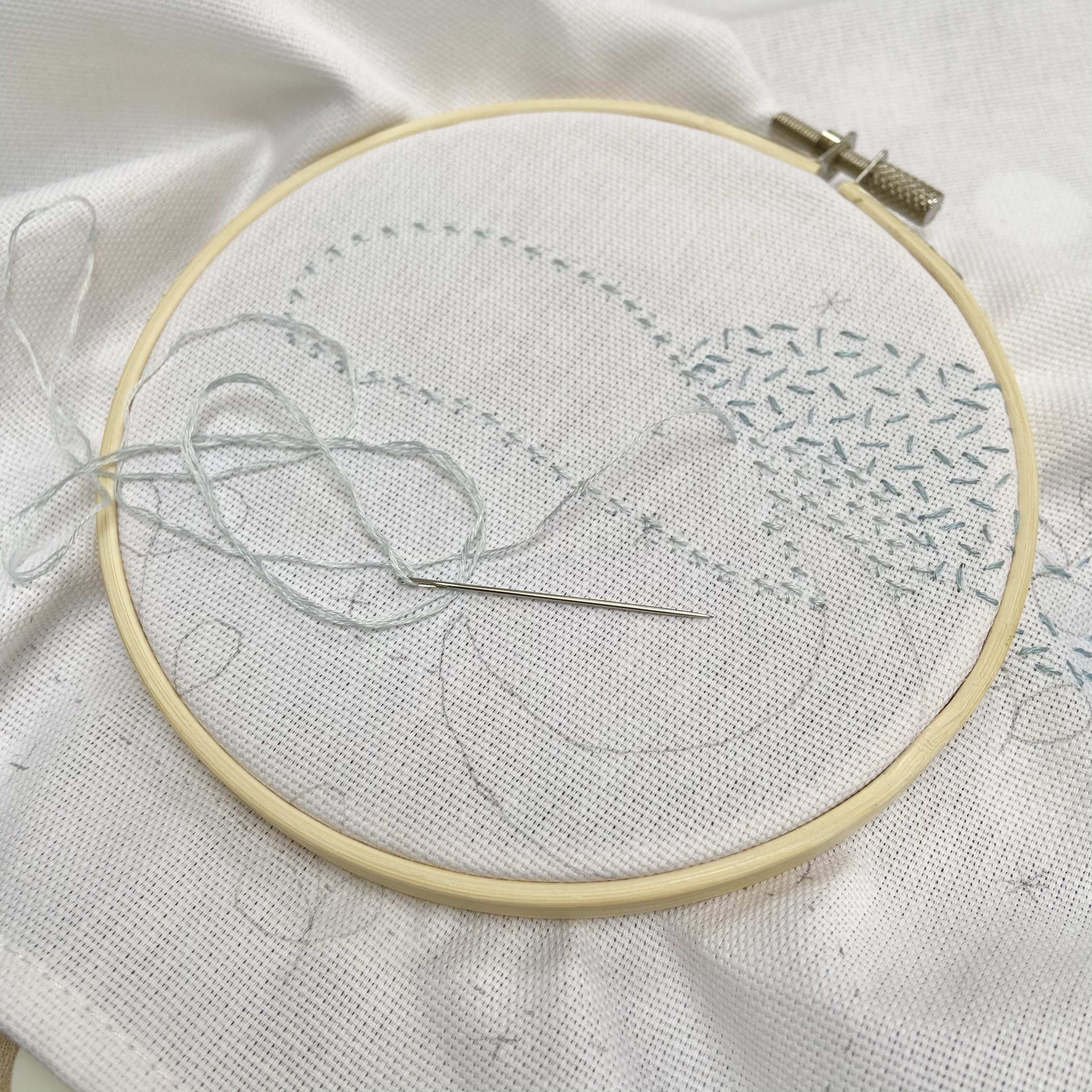 - Embroidery thread x4 (dark grey, mid blue, light blue, dusky pink)