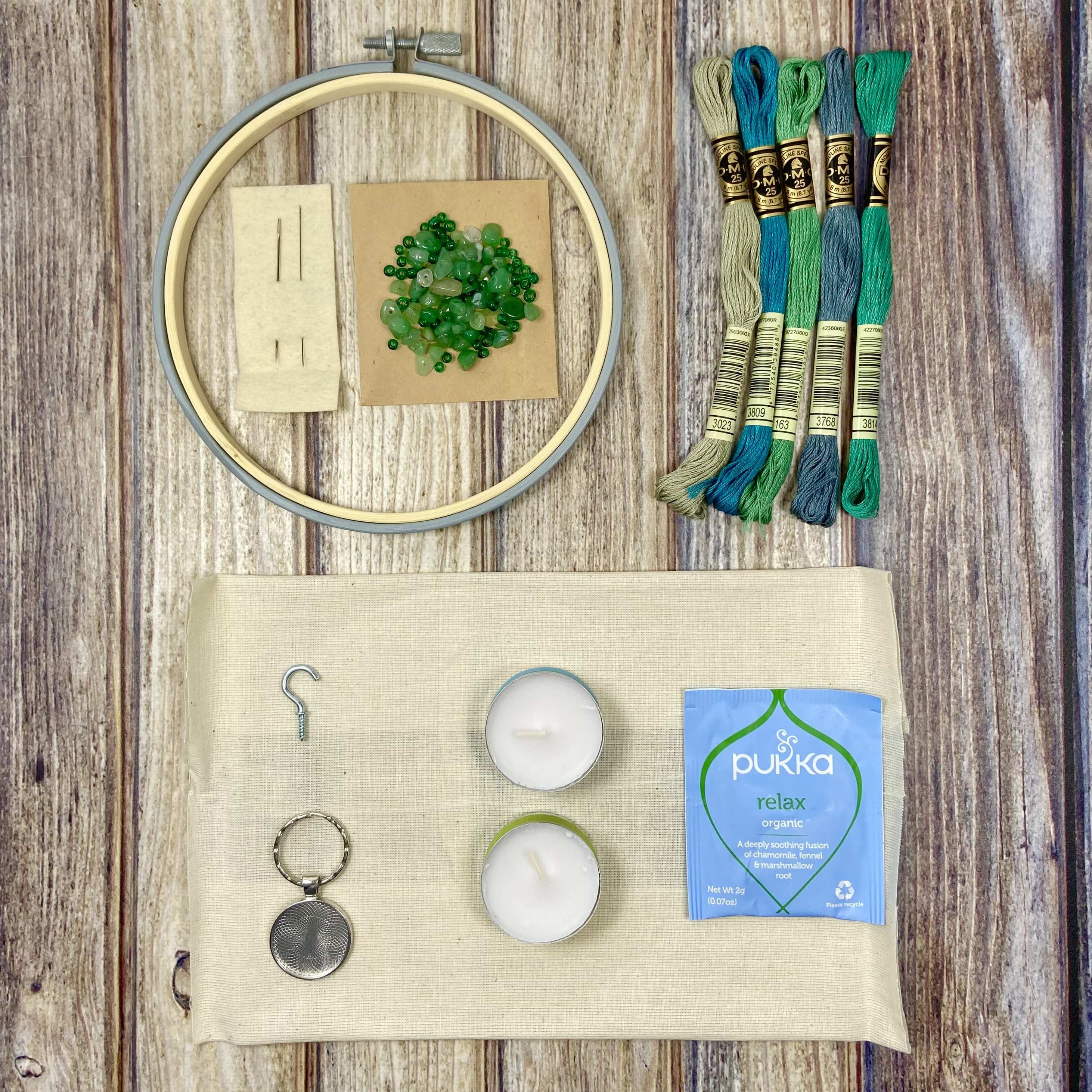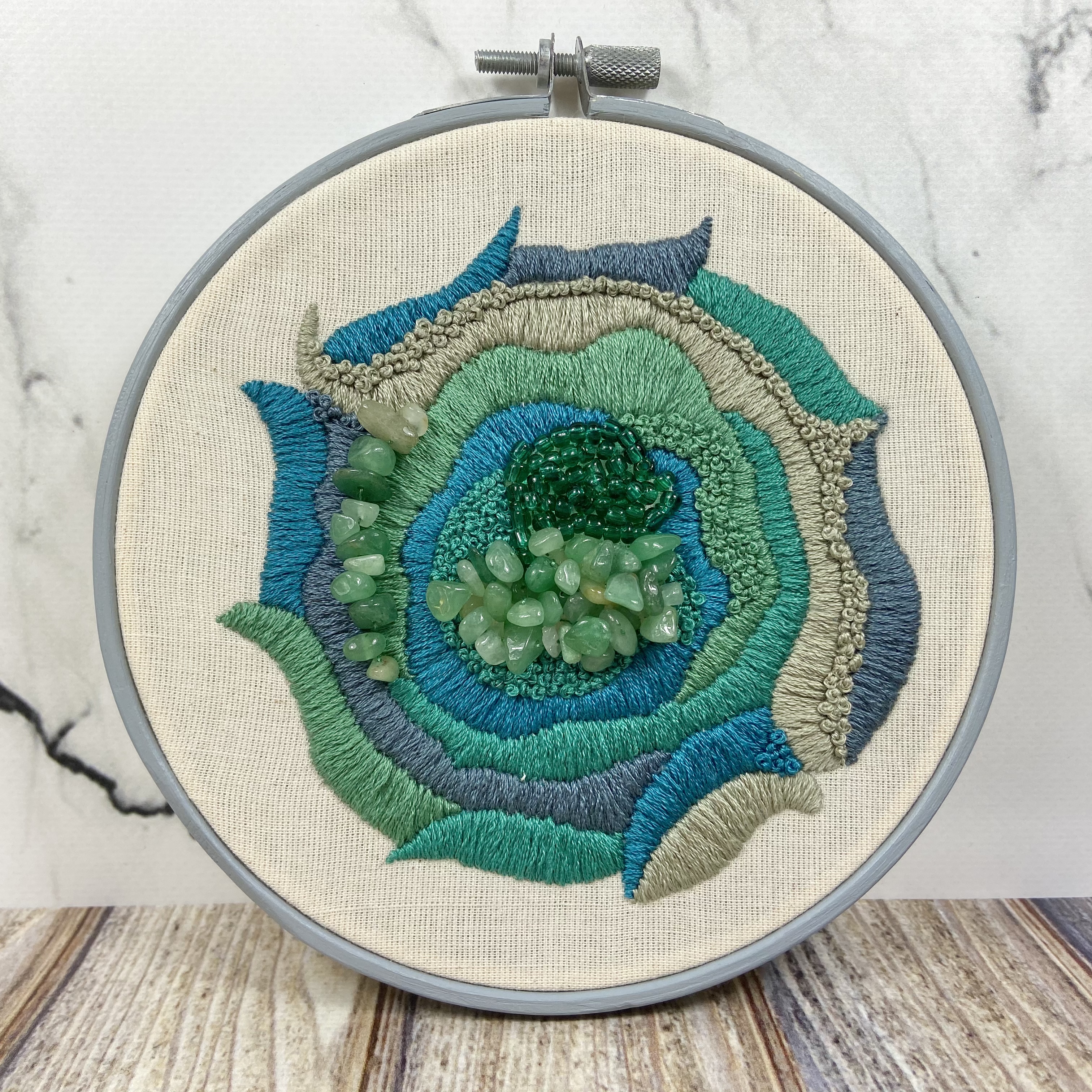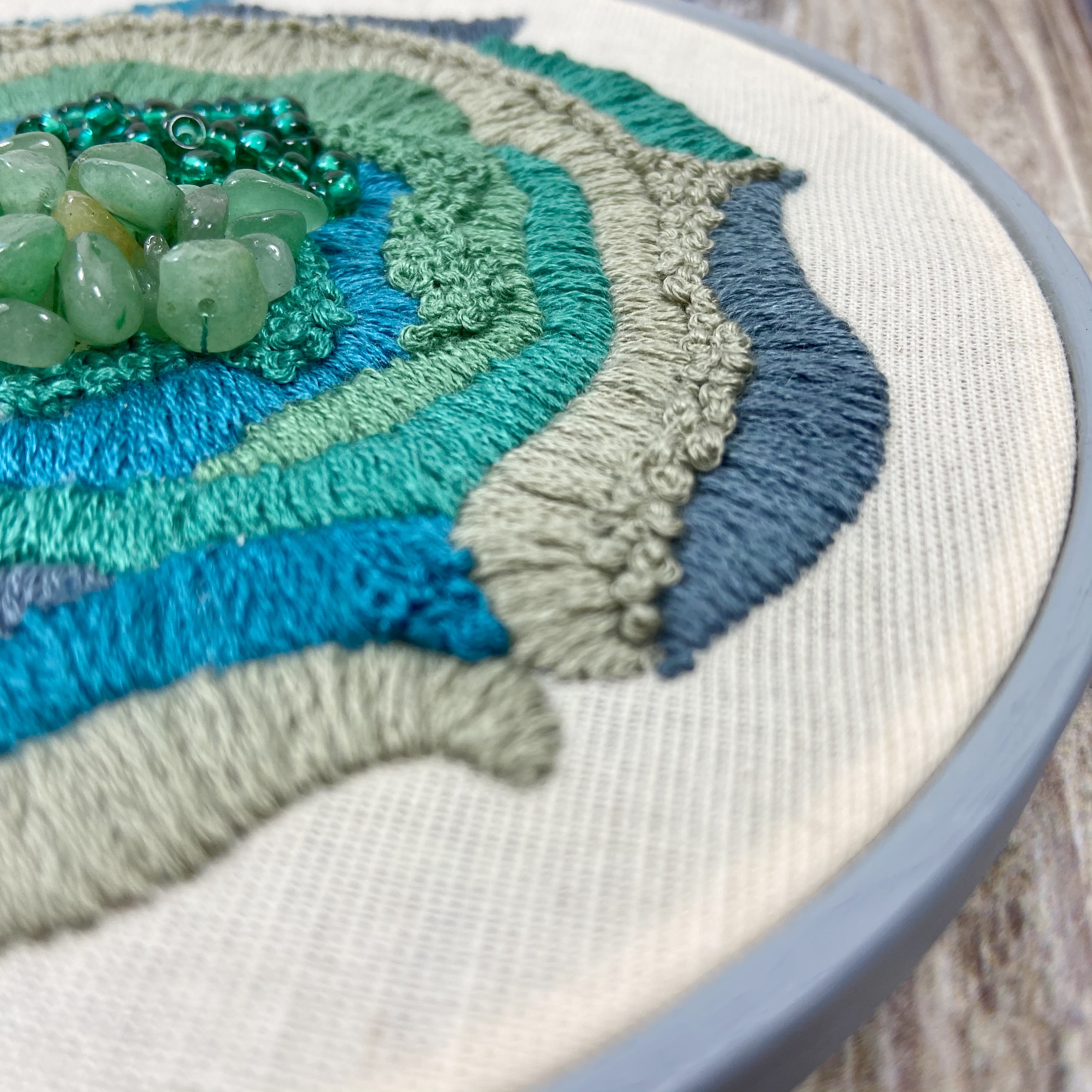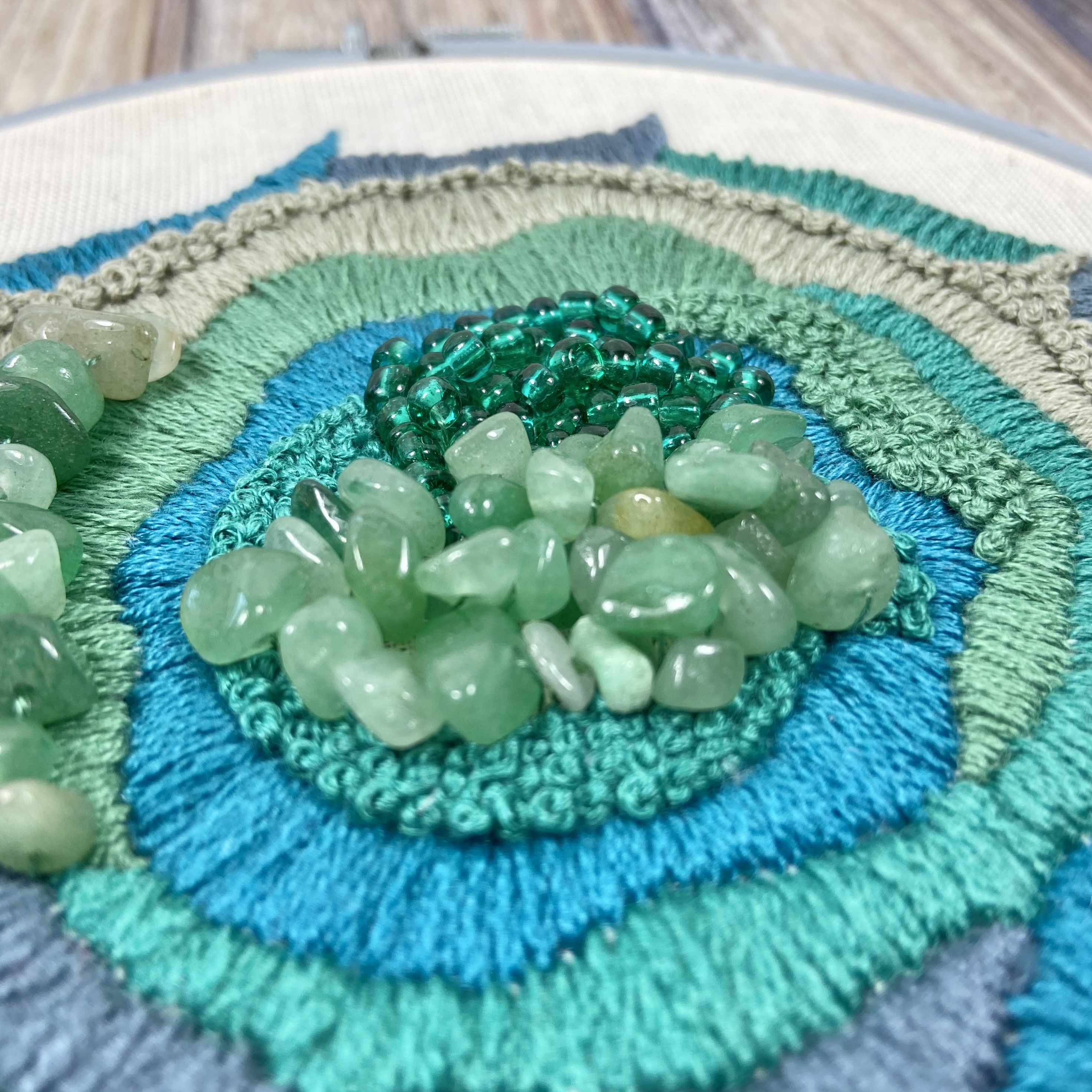 I was attracted to Inner Canvas via Instagram where Nadia, the lady who runs the show, was posting about their latest box, an embroidery entitled ‘Abstractus’. The design is inspired by geodes and features embellishments of Czech glass beads and Aventurine beads – a semi-precious gemstone.