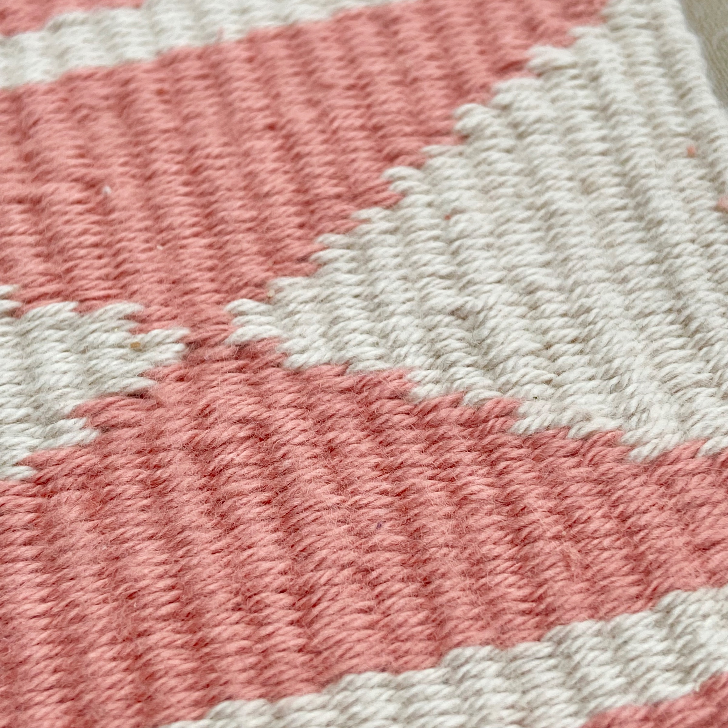 I liked that there were four different designs as it kept the project interesting and meant there was plenty of opportunity to practise geometric shapes. There were two options for weaving around the geometric shapes. One was to weave up to the warp thread next to the shape, but this left a small gap between the shapes so I decided to do the interlocking method instead. This is a lot trickier, but by looping the yarn through the adjacent yarn loop of the geometric shape you can close the gap.